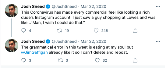 Early last year, a tweet by US comedian Josh Sneed was missing a word. Rather than deleting it, he sent a follow-up tweet about the grammatical error. Why? Mainly because a fellow comedian had already liked it, but also because you can’t edit on Twitter. So he owned it instead.